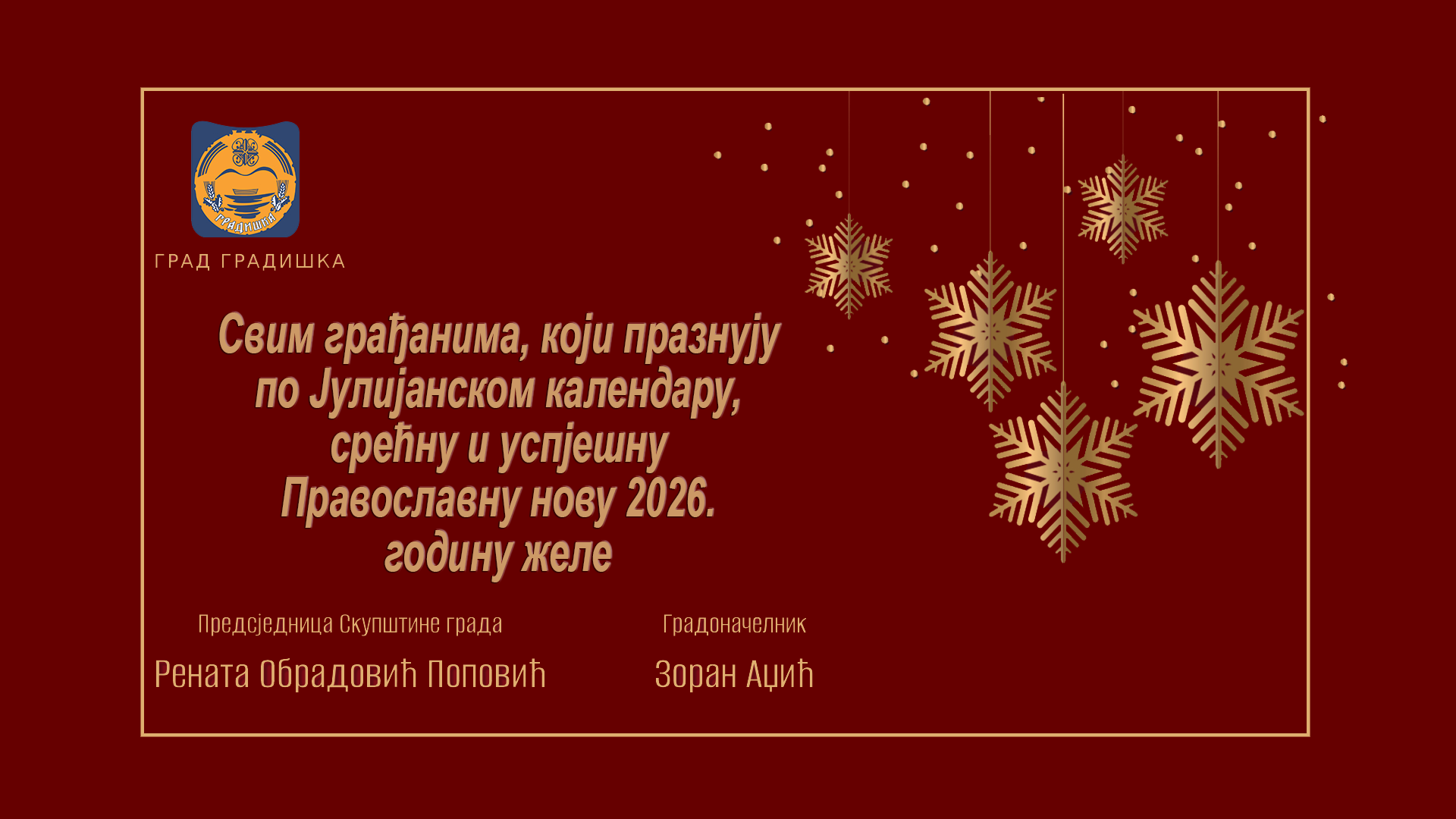 Svim građanima, koji praznuju po Julijanskom kalendaru, gradonačelnik Zoran Adžić i predsjednica Skupštine grada Gradiška Renata Obradović Popović uputili su čestitke.