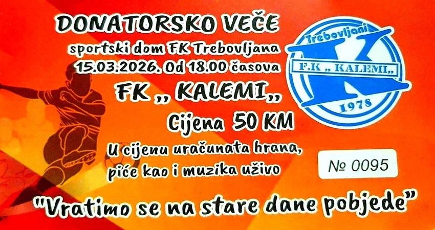 Fudbalski klub „Kalemi“ iz Trebovljana organizuje donatorsko veče koje će biti održano u nedjelju, 15. marta, u sportskom domu sa početkom  u 18 časova.