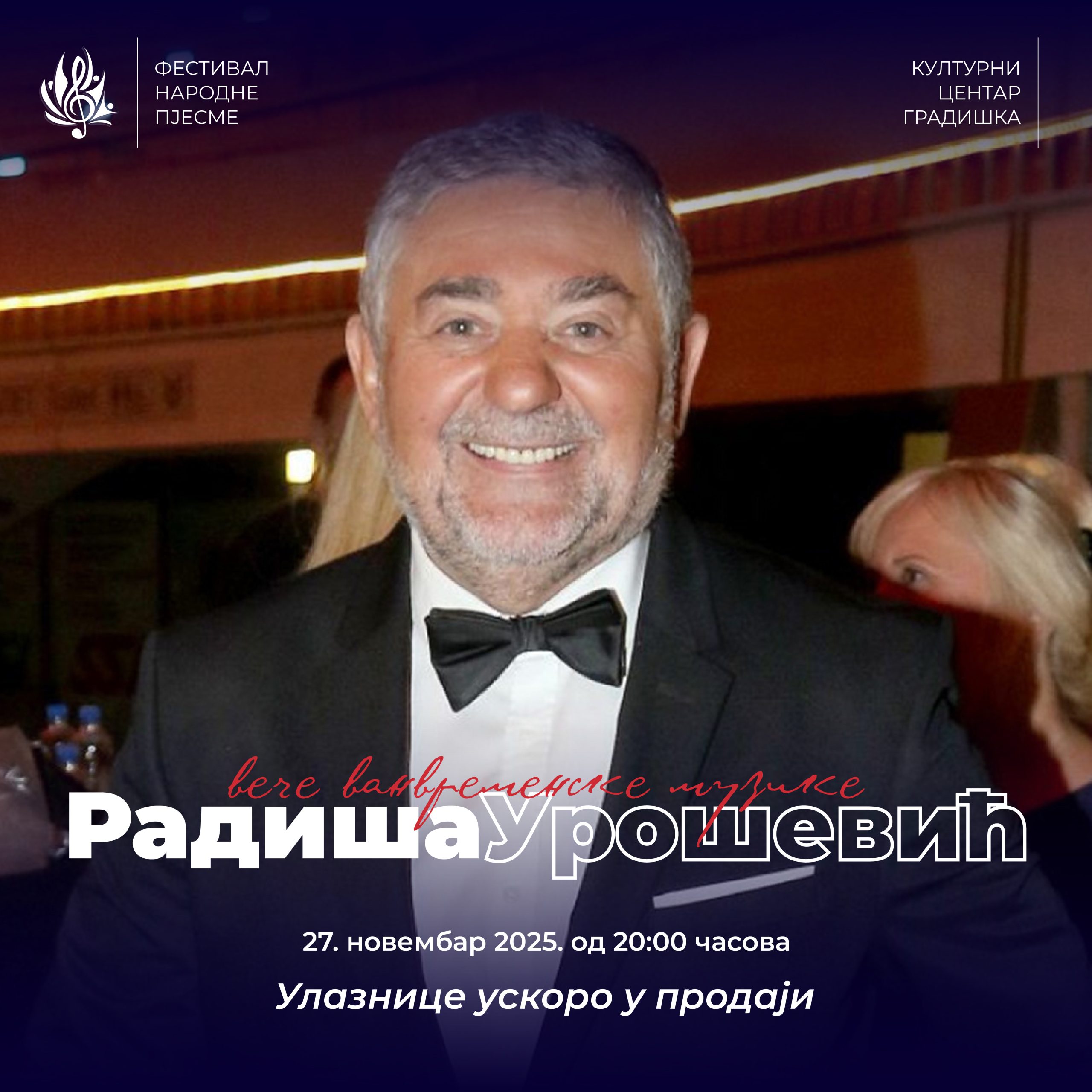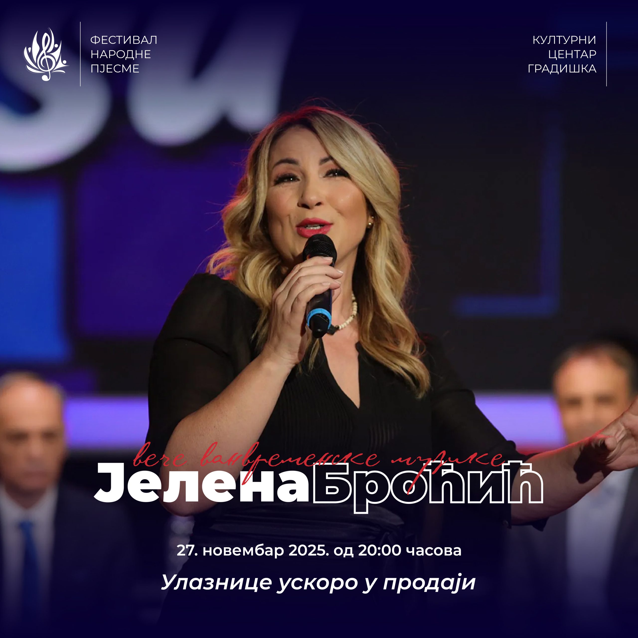 Publika će imati priliku da uživa u nezaboravnim pjesmama velikana narodne muzike: Radiše Uroševića, Jelene Broćić, Branke Sovrlić, Rade Jorovića i drugih izvođača.