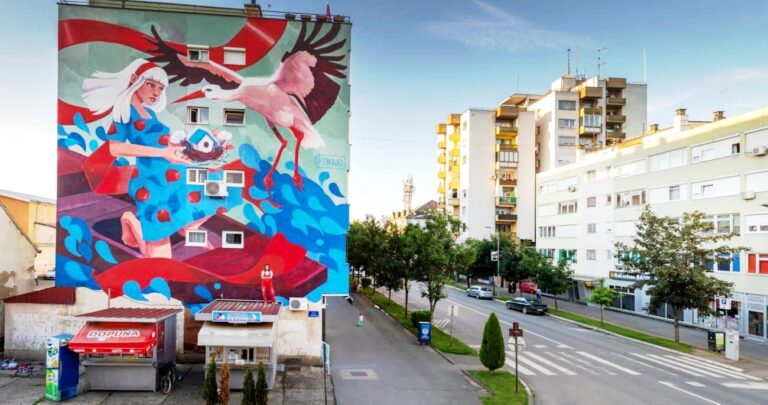 Današnji objektiv bilježi mural “Dom”, autorke Nataše Konjević, koji krasi jednu od gradskih fasada. Ovo djelo nije samo ukras na betonu; ono je lična karta grada. Na njemu dominira roda – simbol plodnosti i činjenice da je Gradiška opština sa najvećim brojem ovih ptica u BiH.