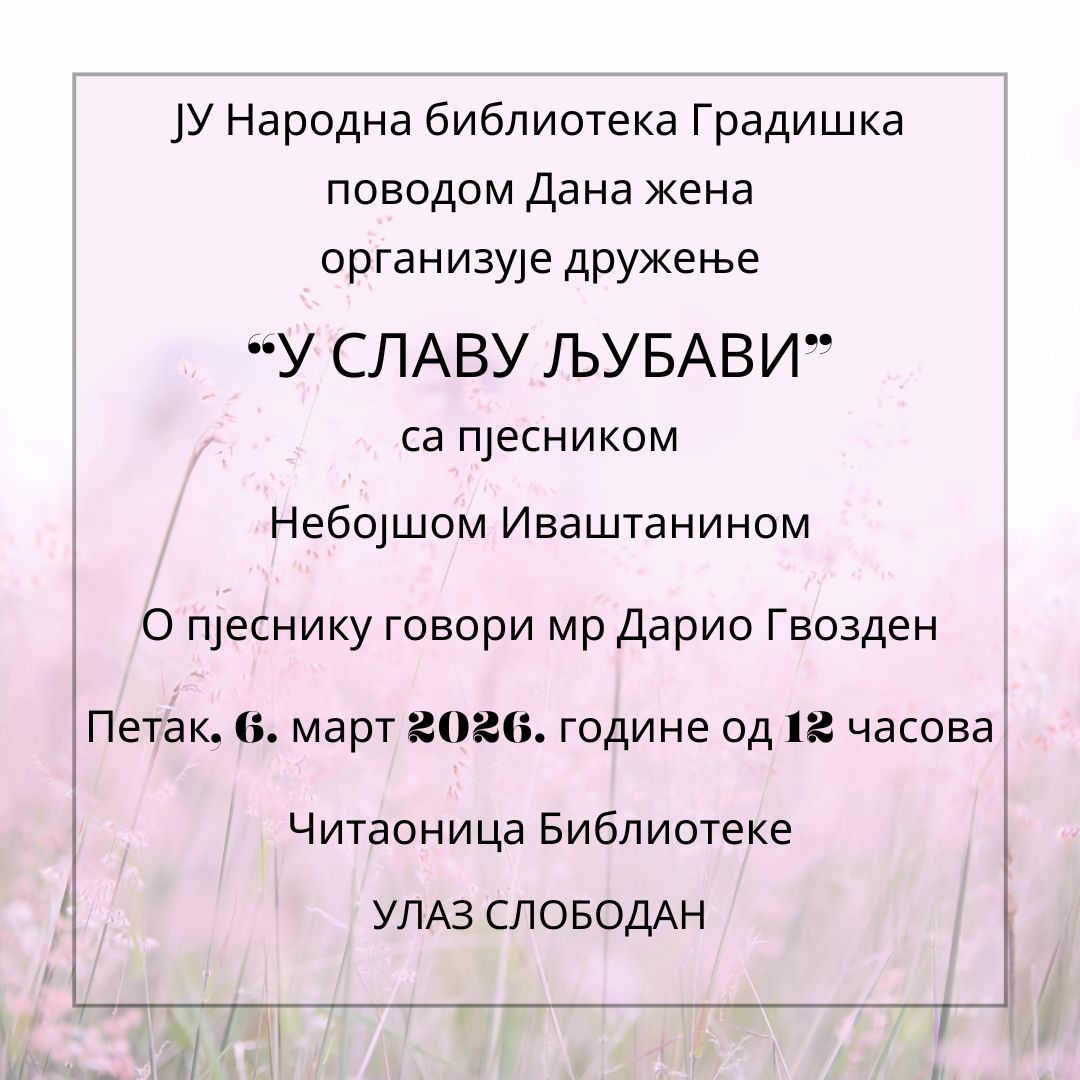 JU Narodna biblioteka Gradiška povodom Međunarodnog dana žena, organizuje književno druženje pod nazivom „U slavu ljubavi“, koje će biti održano u petak, 6. marta sa početkom u 12 časova, u čitaonici Biblioteke.