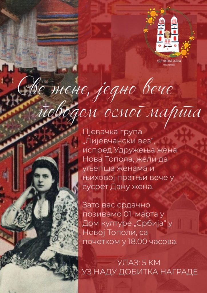 Pjevačka grupa „Ljevčanski vez“ organizuje u nedjelju, 1. marta, druženje povodom Međunarodnog dana žena. Događaj pod nazivom „Sve žene, jedno veče“ biće održan u Dom kulture „Srbija“ u Novoj Topoli sa početkom u 18 časova.