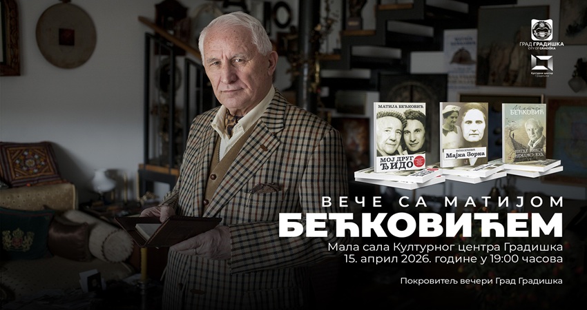 Grad Gradiška u saradnji sa izdavačkom kućom Vukotić Media iz Beograda i JU „Kulturni centar“ Gradiška u okviru programa obilježavanja Dana Grada Gradiška prirediće veče sa Matijom Bećkovićem sutra, 15. aprila u 19 časova u Kulturnom centru Gradiška.