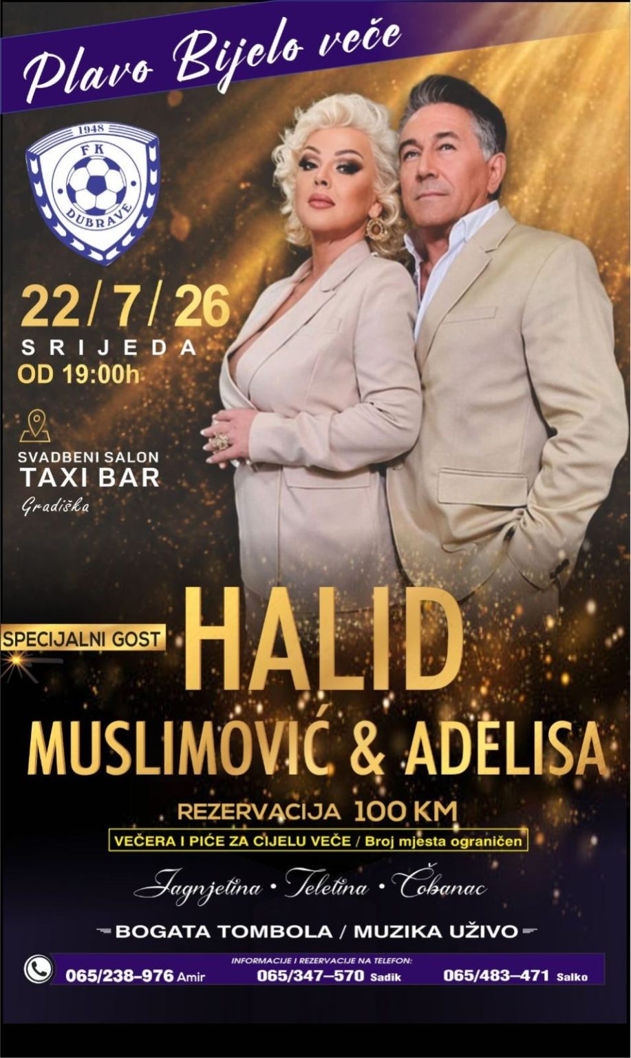 Gradiška će 22. jula 2026. godine biti domaćin posebnog muzičkog događaja pod nazivom „Plavo-bijelo veče“, koje organizuje FK Dubrave. Ova svečana večer održaće se u srijedu, sa početkom u 19:00 časova, u svadbenom salonu Taxi Bar u Gradišci.