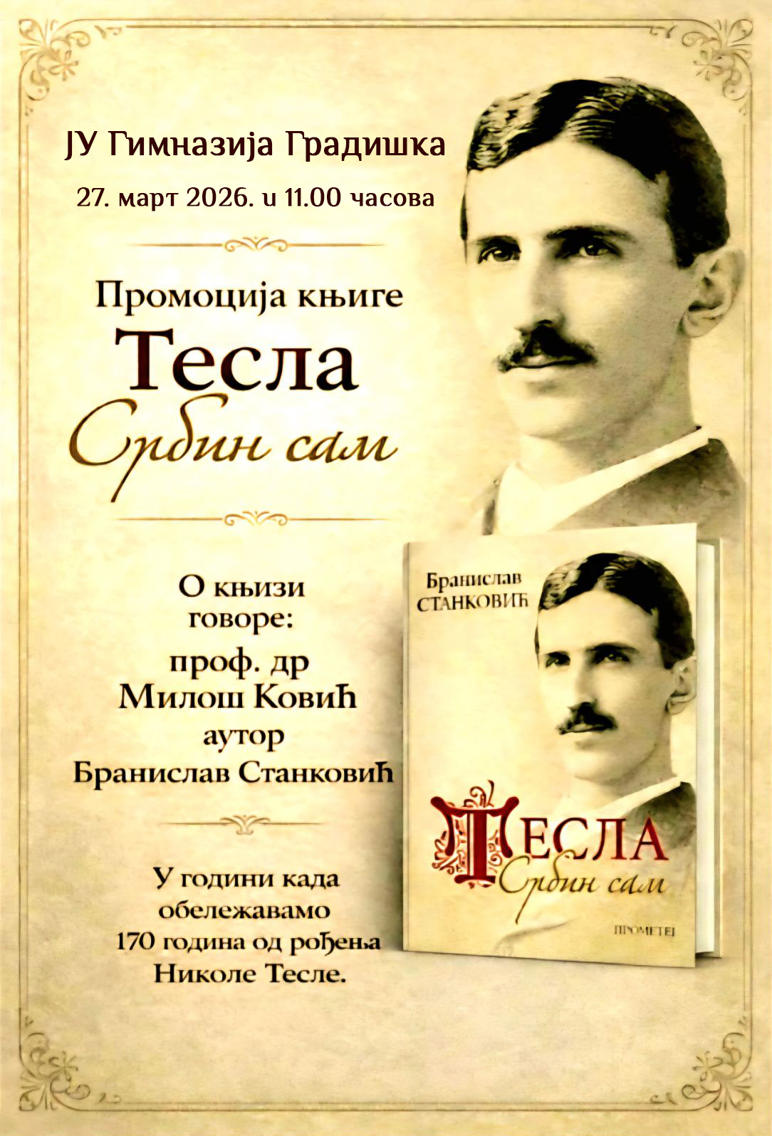 U ,,Gimnaziji Gradiška u petak, 27. marta u 11 časova u saradnji sa Gradom Gradiška biće predstavljena monografija ,,Tesla, Srbin sam“ autora Branislava Stankovića.