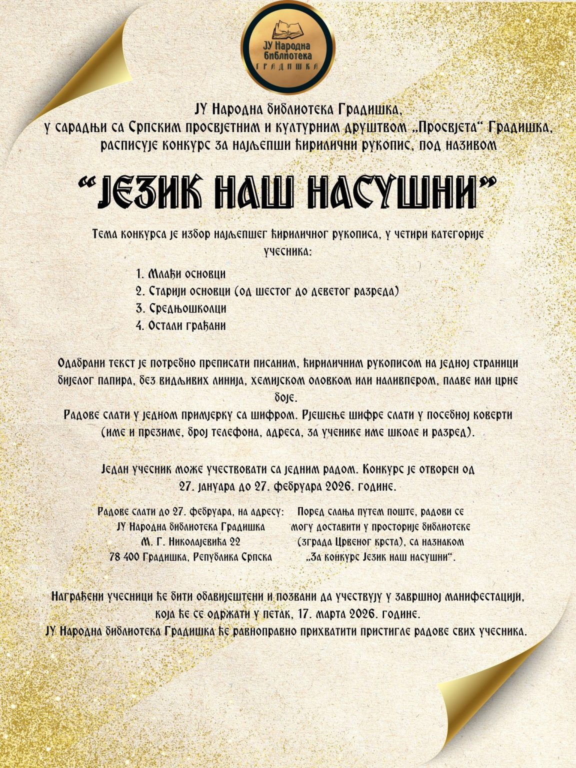 Svi zainteresovani iz cijele Republike Srpske radove mogu slati na adresu Mitropolita Georgija Nikolajeviča 22, 78400 Gradiška ili lično dostaviti u prostorije biblioteke. Završna manifestacija, biće održana u petak 17. marta 2026. godine u prostorijama biblioteke.
