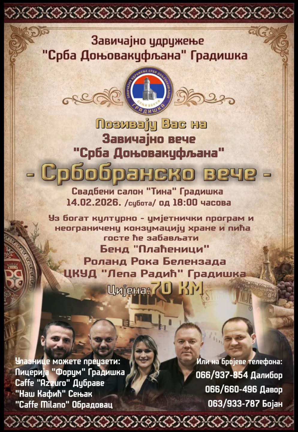 Zavičajno udruženje Srba Donjovakufljana iz Gradiške organizuje “Srbobransko veče”, koje će biti održano 14. februara u Svadbenom salonu „Tina“.